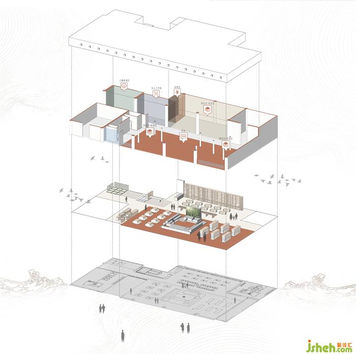 為此,在分析空間屬性、功能需求及場(chǎng)域的主要使用人群后,我們將閩南文化、多功能性、開(kāi)放性等作為空間營(yíng)造的方向,機(jī)場(chǎng)館設(shè)計(jì)并延續(xù)“母親的房子”圖書(shū)館的脈絡(luò),為其引入了獨(dú)具閩南特色的元素,使空間兼具文化傳播的場(chǎng)域?qū)傩浴?