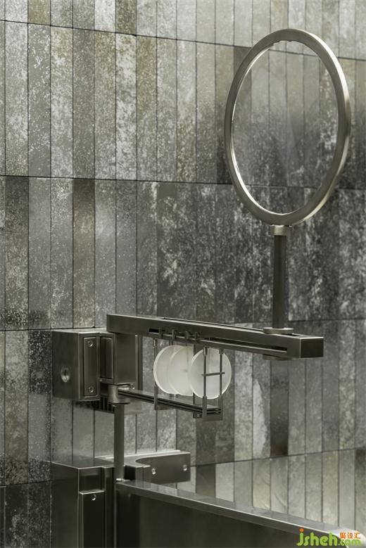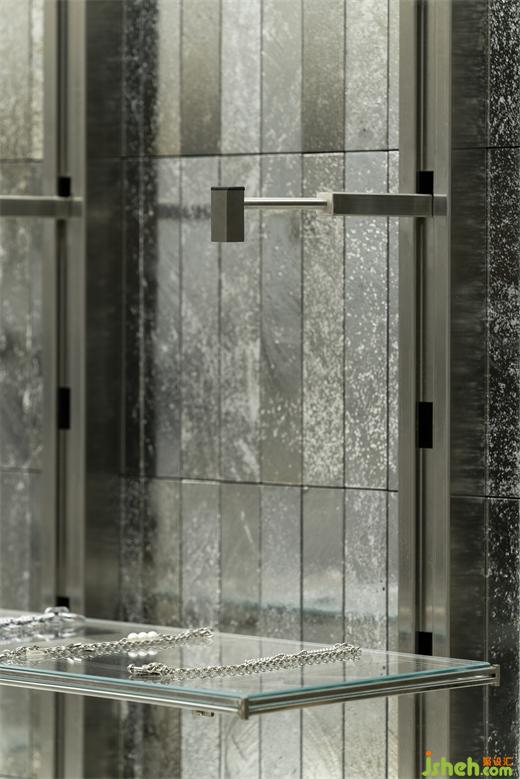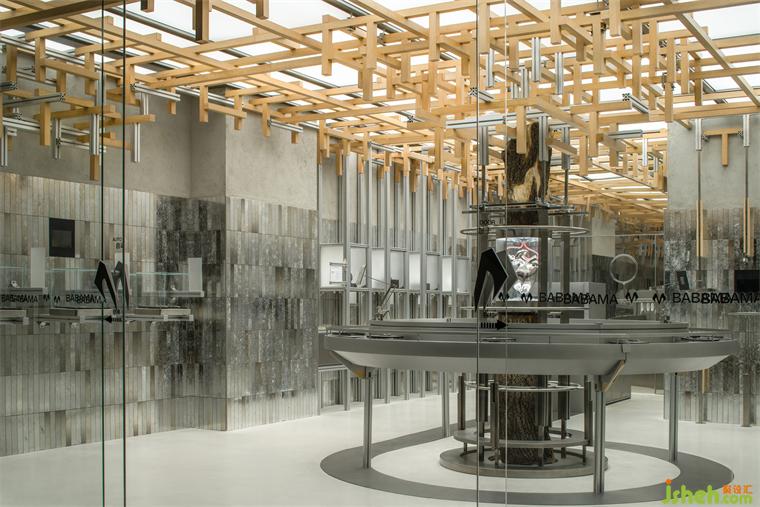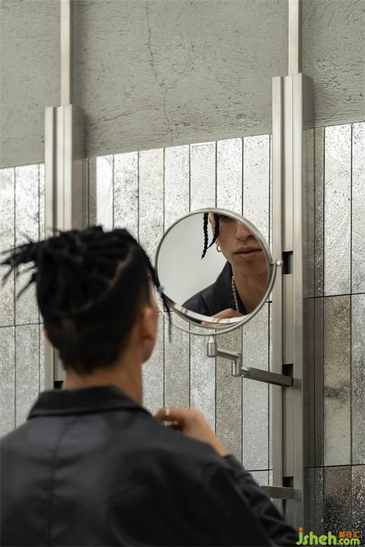 金屬、玻璃等與主體一脈相承材質(zhì)的穿插,圓形鏡子的增設(shè),也考慮到了受眾搭配試戴環(huán)節(jié)的需求,展廳設(shè)計使其在交互體驗中自然地完成選購。