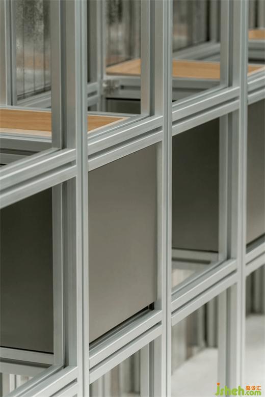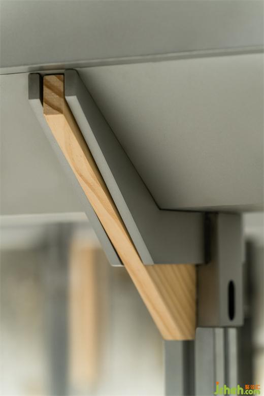 鋁型材與木頭的材質(zhì)的對撞,一方面延續(xù)了品牌既有的工業(yè)屬性,另一方面則通過取材自然元素加入,在一定程度上中和了空間中強勢的機械屬性,展廳設(shè)計創(chuàng)造出和諧共生的場景。