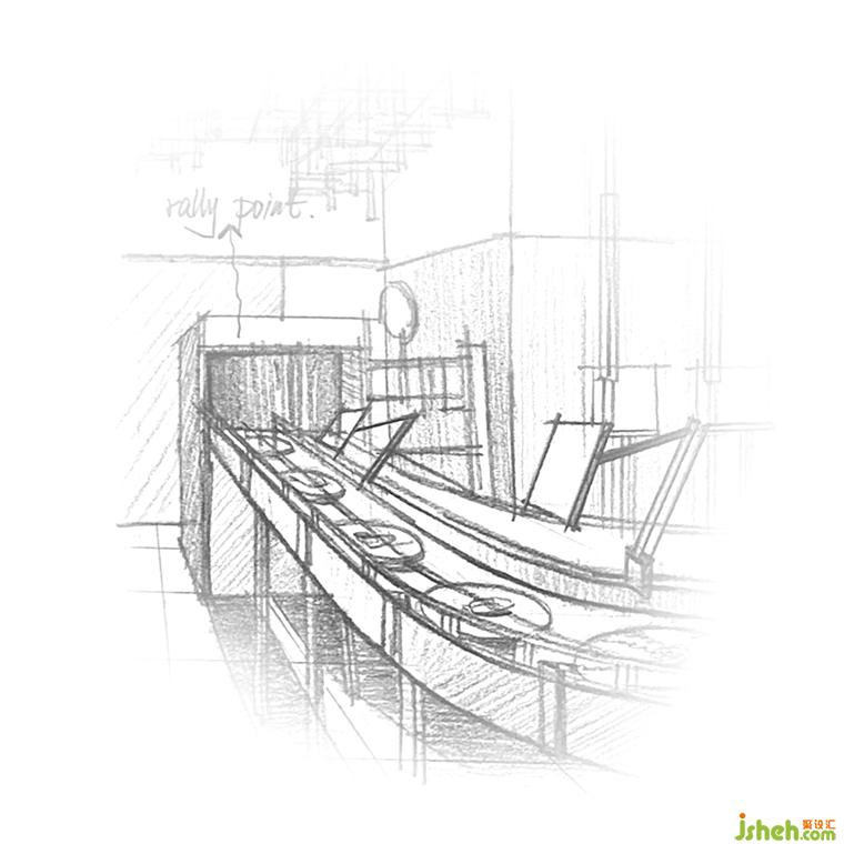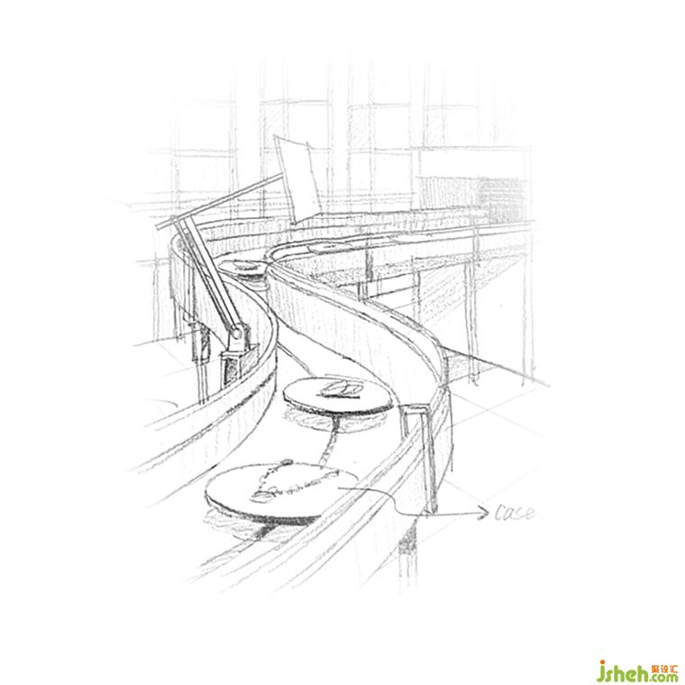 如果將以機械心臟樹為視覺核心,所囊括的由頂部至四面陳列區(qū)域是基于核心概念之下的空間立面呈現(xiàn),那么回歸空間平面重點——傳送帶的設(shè)置,則是進一步貼合實際銷售功能,展廳設(shè)計圍繞商品展示、試戴、售賣與打包的系列行為所設(shè)計的動線閉環(huán)。