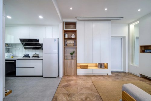 1. 拆掉原廚房的墻面,做成開(kāi)放式廚房。使整體空間變得敞亮通透,同時(shí)解決了原廚房采光差的問(wèn)題。