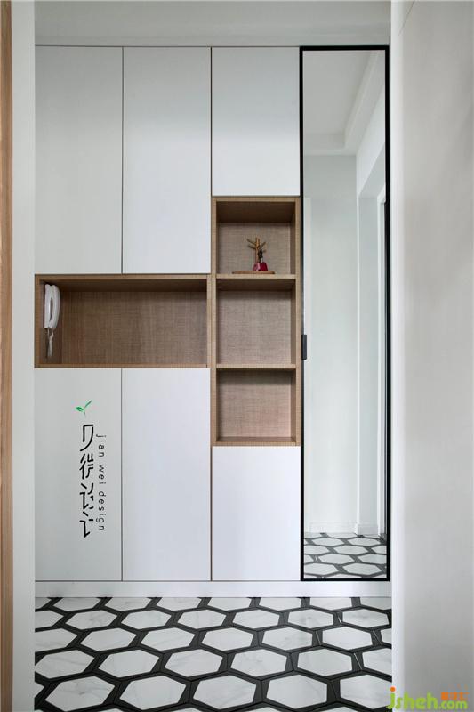 1、入戶門(mén)改外開(kāi),玄關(guān)地面使用異形花磚鋪貼分割空間,同時(shí),增加空間趣味性,鞋柜柜門(mén)巧用鏡面,讓玄關(guān)空間看起來(lái)更大