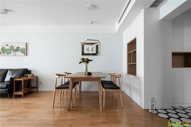 餐邊柜與玄關(guān)大面積留白,原木方格如同跳躍的陽(yáng)光投影在墻面