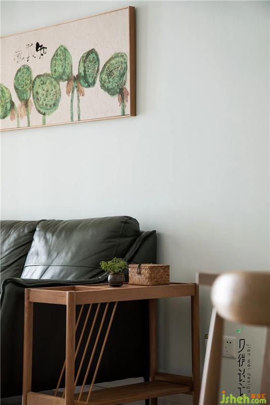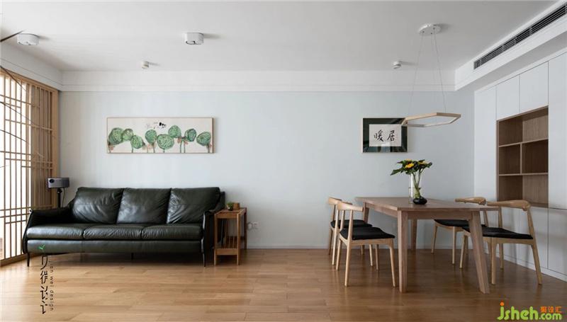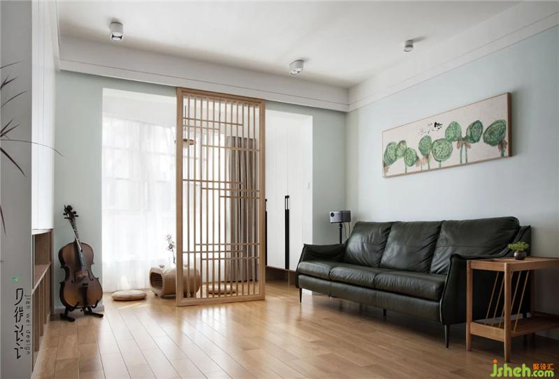 日式原木的溫暖與綠色元素在空間里流動(dòng)和穿透,透過(guò)室內(nèi)鏤空木質(zhì)屏風(fēng)和墨綠色沙發(fā)