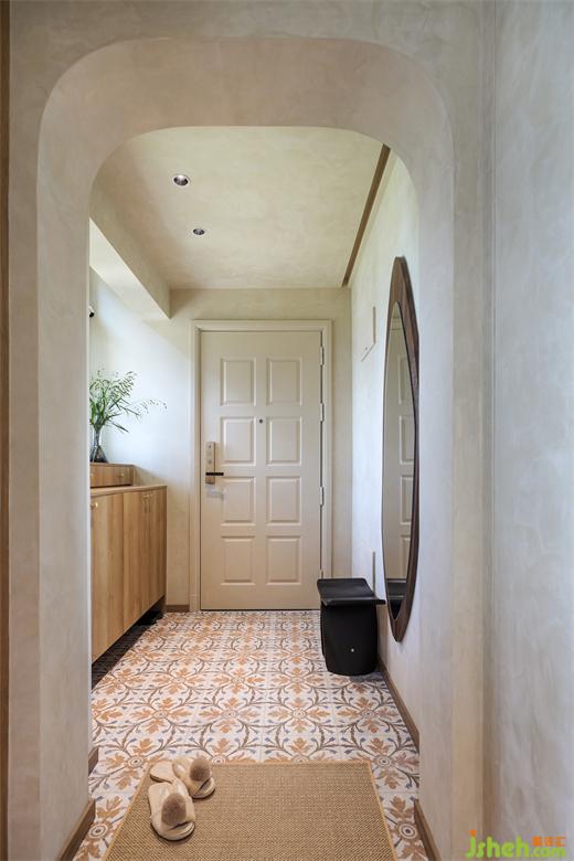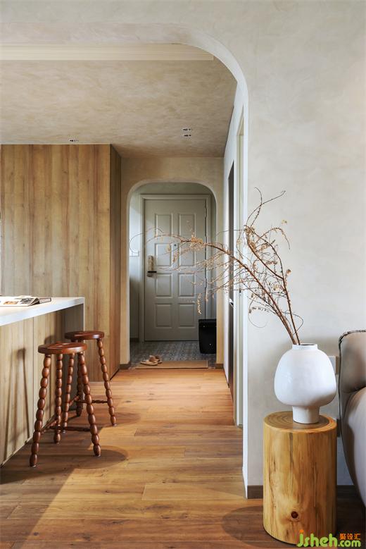 屋主買房時,入戶這個位置是贈送了一個入戶花園的,亞運城天峯家裝設(shè)計我們就把玄關(guān)區(qū)域從原始的位置挪出來,放置在入戶花園這里,為了不影響采光,我們鞋柜區(qū)域只做了一米高,因為空間結(jié)構(gòu)問題鞋柜區(qū)域的深度足足有55公分深,為了解決過深的柜體造成的鞋柜笨重問題,我們在鞋柜上方設(shè)置了一排抽屜,既方便又實用,質(zhì)樸木紋紋理結(jié)合黃銅的小把手,簡約又不失雅致,柜體和結(jié)構(gòu)承重梁位的弧形過渡,都在視覺上弱化了這個笨重感的問題。鞋柜的小細(xì)節(jié)包括強弱電箱刷了和墻體相同的藝術(shù)涂料,入戶門的顏色也是按照涂料的顏色去選擇的,焦糖色的小花磚、入戶異形的鏡子、黑色的蝴蝶凳子,棉麻的白色紗簾、過道的拱形元素,裝修公司在這豐富的視覺層次下,濃郁的居家氛圍感呼之欲出,自然溫柔有力量。