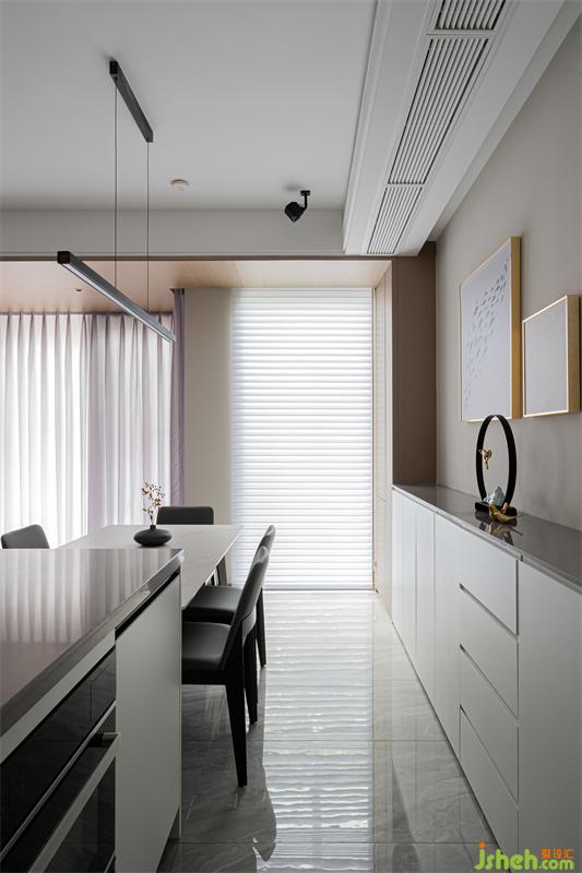 原客廳外陽(yáng)臺(tái)納入客廳餐廳擴(kuò)大客餐廳空間,讓餐廳和島臺(tái)連接形成“洄游”空間,來(lái)增加活動(dòng)空間。餐廳家具融入了“古風(fēng)”的元素,溫文爾雅的中式風(fēng)在溫馨的空間氛圍里,展現(xiàn)著藝術(shù)的多元化。