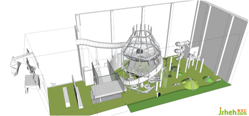 在一層中設置了服務區(qū)、換鞋區(qū)、家庭衛(wèi)生間等輔助空間。同時整個一層為3-5歲的兒童量身打造各類適合他們的游樂空間,集合了攀爬、穿越、鉆行等各類項目,讓學齡前的孩子們通過各種手段來更好的接觸、認知這個世界。