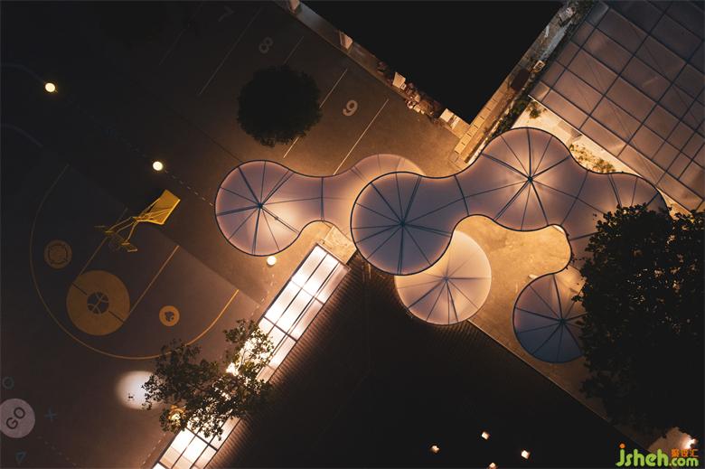 通過檐廊和雨棚來拓展生活空間,同時選擇易于建造的鋼構(gòu)+陽光板、鋼構(gòu)+膜的建造方式增加空間尺度與情感層次。檐廊的造型介于小屋和半亭之間,最簡單的坡屋面完成每個孩子心中提供庇護的家的隱喻。排列成一串序列的檐廊完全改變了原來建筑立面水平檐口+標準窗洞的冷漠,互相獨立,卻又同時形成一個如同群山起伏的整體,象征著孩子們手拉手的村落。云朵形態(tài)的雨棚,如同媽媽的懷抱消融原本各不相干的建筑體量,又好似孩子們的嬉鬧追逐,串聯(lián)起整個場地的建筑與自然。尊重一草一木,給予平等的關(guān)懷,在情感安頓之后仿佛又回想起第一次驅(qū)車進入北川的那一天,眼前那延綿起伏的山與山間漂浮的云。
