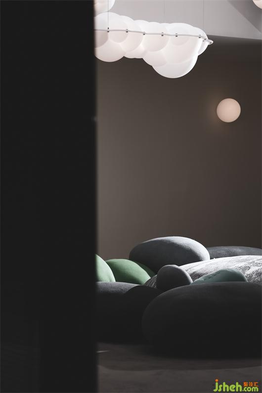橢圓形下沉區(qū)采用軟包堆疊覆蓋的形式,創(chuàng)造性為孩子們構(gòu)筑一個(gè)柔軟的“小窩”。電視墻則后退式隱匿于片墻之中,搭配動(dòng)態(tài)升降裝置以“動(dòng)態(tài)+科技+藝術(shù)”手法營(yíng)造多維展示空間。