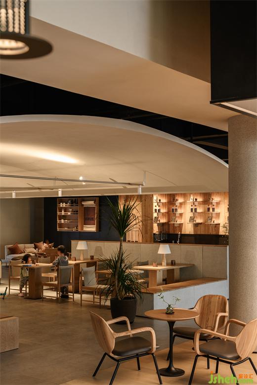 面對這樣一個(gè)承載著這樣的復(fù)合業(yè)態(tài)的空間,我們改造上既需要盡可能通過連續(xù)性開放性的空間保證運(yùn)營方日后的靈活使用,再通過柔性的手法來塑造空間的邊界,劃定領(lǐng)域范疇,在保證合理的安置好餐、酒、咖啡吧等商業(yè)功能外,更重要的是以場所為媒介為社區(qū)的人們提供一處具有社區(qū)服務(wù)性質(zhì)的公共空間,為社區(qū)的人們提供了一個(gè)自我學(xué)習(xí)與親子相伴的空間,人們也這里相聚、約見。