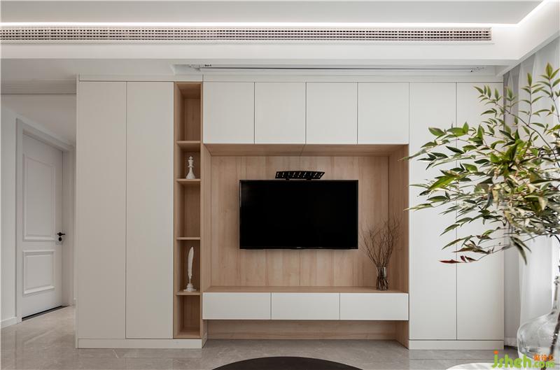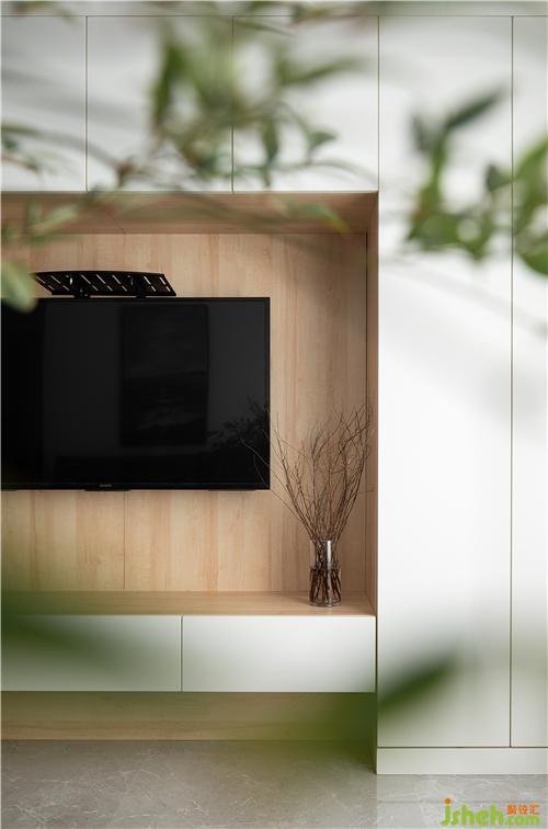 客廳的電視墻做了一整排裝飾柜,增加了客廳的儲(chǔ)物空間南京室內(nèi)設(shè)計(jì)師,在裝飾柜的墻面還有一個(gè)隱藏式的幕布,不光增加了儲(chǔ)藏空間,而且還兼有娛樂的設(shè)施。