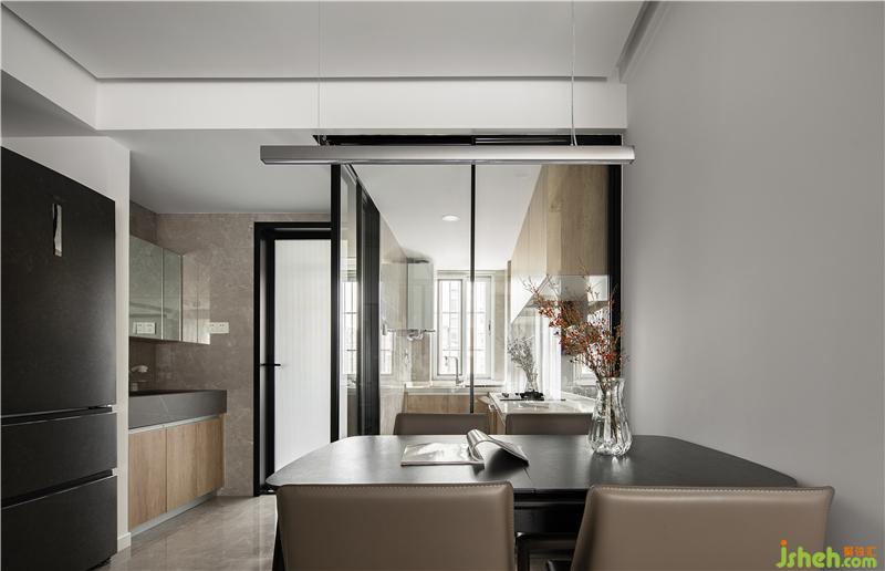 餐廳區(qū)域及廚房正面區(qū)域,餐廳的頂面和客廳的頂面設(shè)計(jì)為一體南京室內(nèi)設(shè)計(jì)師,四周做了反燈帶處理,看起來既簡(jiǎn)單還大方。