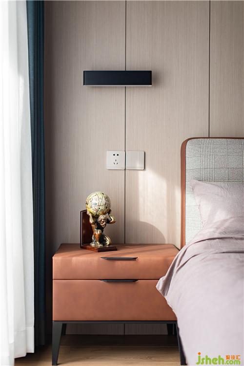 臥室的門和平時臥室門都不一樣,臥室的門是開在中間所以采用了現代手法的谷倉門設計,門的顏色和臥室的背景融為一體,滿足整體效果而且保持了臥室的私密性。