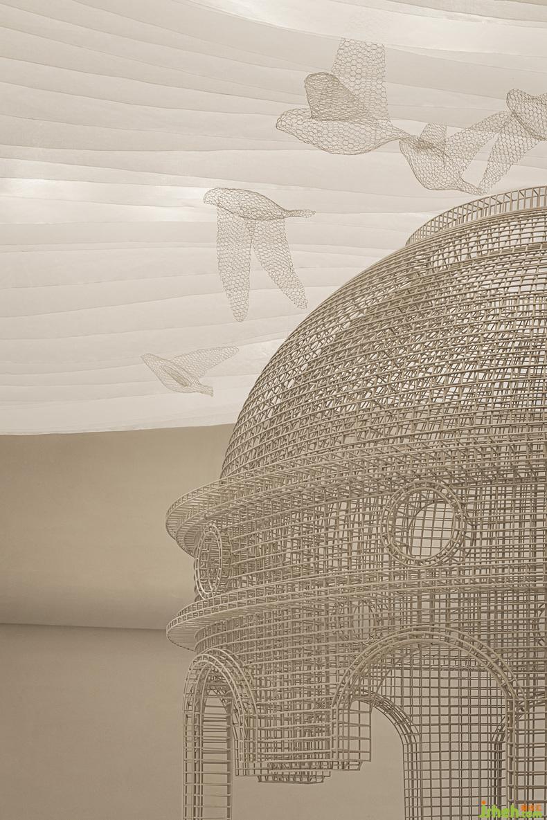 在這個虛幻的樂貝世界中,人反倒是囚禁在籠中的動物,而小鳥卻在籠子外自由飛翔。這在告訴小朋友萬物始于自然,大自然孕育了一切生命,如果人類過度開采捕獵,最終大自然會將人類束縛住,人與自然應該是生命共同體。前臺接待區(qū)設(shè)計師用鐵絲模擬鳥籠造型,迎賓服務(wù)生在籠子內(nèi)歡迎光臨樂貝的每個小朋友,是整個動物王國的開端。