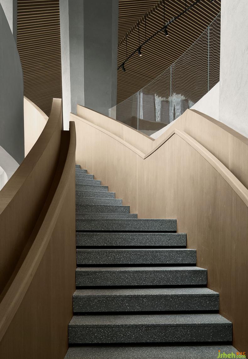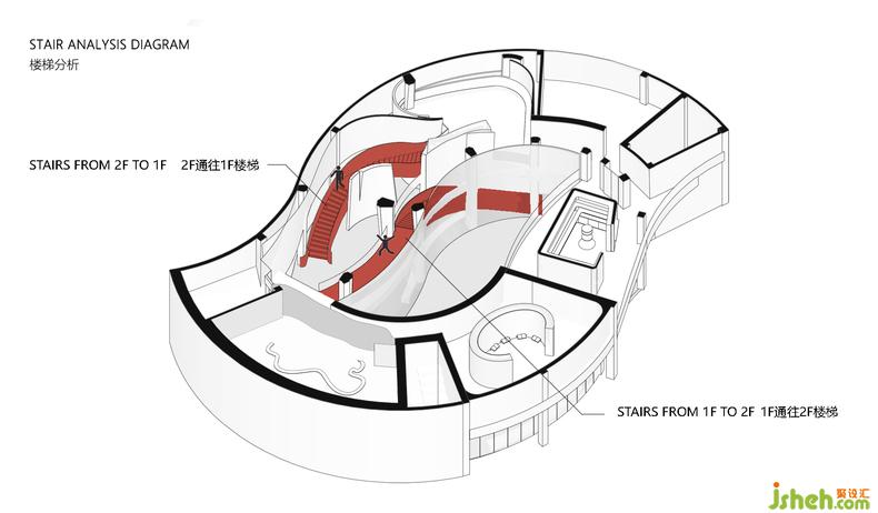 在生命之源性文化展館的整個(gè)前廳造型設(shè)計(jì)上,設(shè)計(jì)團(tuán)隊(duì)通過兩條曲面造型的樓梯貫穿整個(gè)前廳,文化展館設(shè)計(jì)一條蜿蜒向上,一條順延向下,兩條樓梯于前廳視角中交織在一起,正寓意著兩性中男性與女性角色。他們相互獨(dú)立,卻又相互平等,兩者相望。