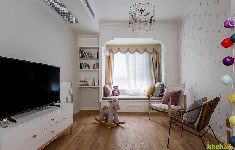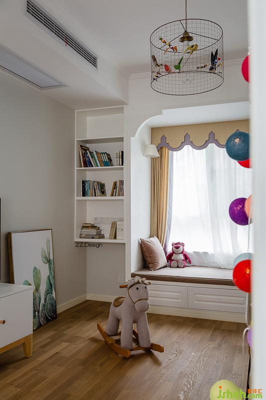 室內(nèi)設(shè)計(jì)師方案溝通過(guò)程中能感受到業(yè)主對(duì)小公舉滿滿的愛(ài),除了兒童房還專(zhuān)門(mén)準(zhǔn)備了一間活動(dòng)室,讓孩子在這看書(shū),玩耍,會(huì)客。讀書(shū)角是把飄窗加寬做了地柜,兩邊做了書(shū)架,方便孩子取用。法國(guó)Mathieu Challieres volière 鳥(niǎo)籠吊燈色彩活潑充滿童趣。