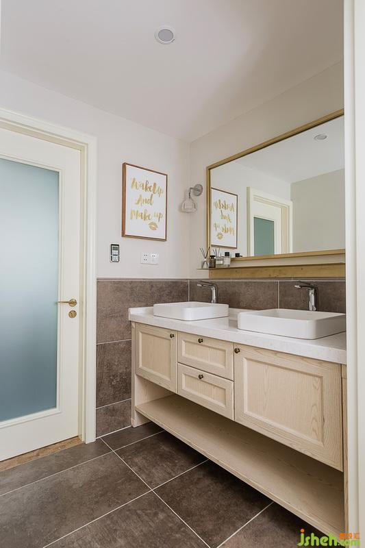 由于客衛(wèi)變成兒童房的衛(wèi)生間了就把原來(lái)的主衛(wèi)改成了客衛(wèi),做了干濕分離使用起來(lái)更方便。干區(qū)墻面做的半截磚半截防水乳膠漆,定制的雙臺(tái)盆洗漱臺(tái)既實(shí)用又美觀。