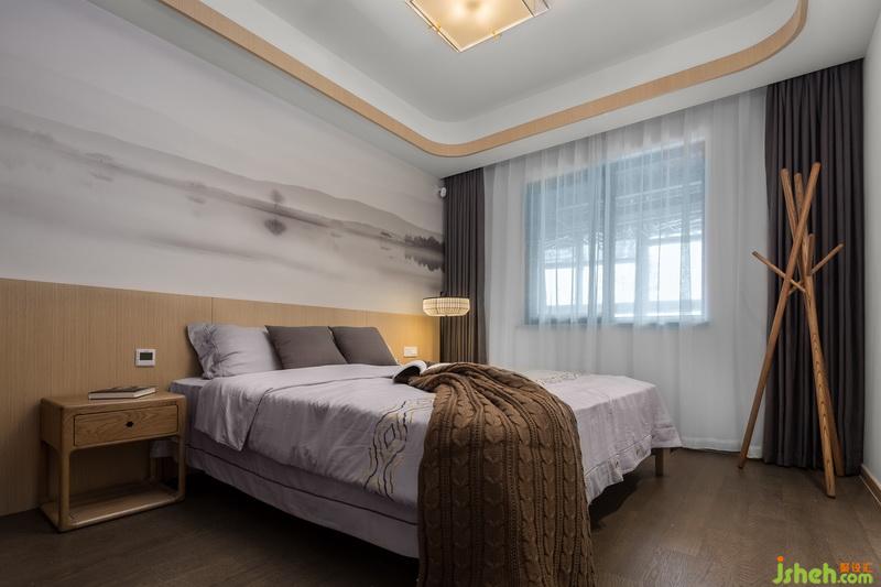 室內(nèi)設(shè)計者在次臥室用了無靠背的床架,跟墻面的半截裝飾板搭配的天衣無縫。上面半截壁畫畫面靜謐悠遠,很契合臥室的使用功能。