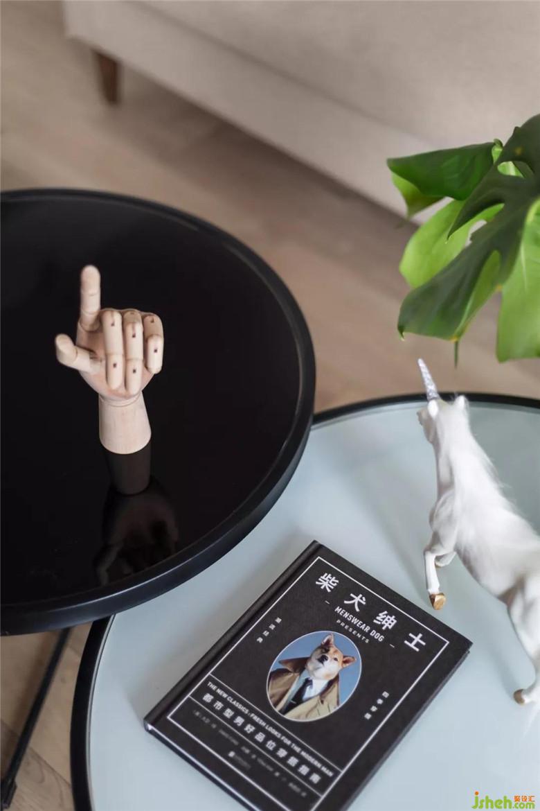 、這個戶型客廳采光不知特別好,只在邊角處有個不大的落地窗,所以硬裝軟裝搭配都是以淺色為主,淺棕色的復(fù)合地板搭配大地色的轉(zhuǎn)角沙發(fā),黑白相間的一組玻璃茶幾,姿態(tài)纖細(xì)。