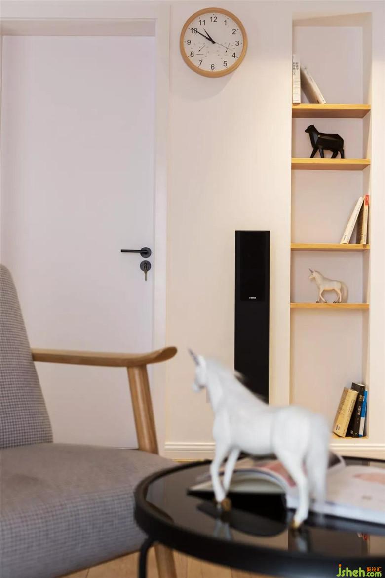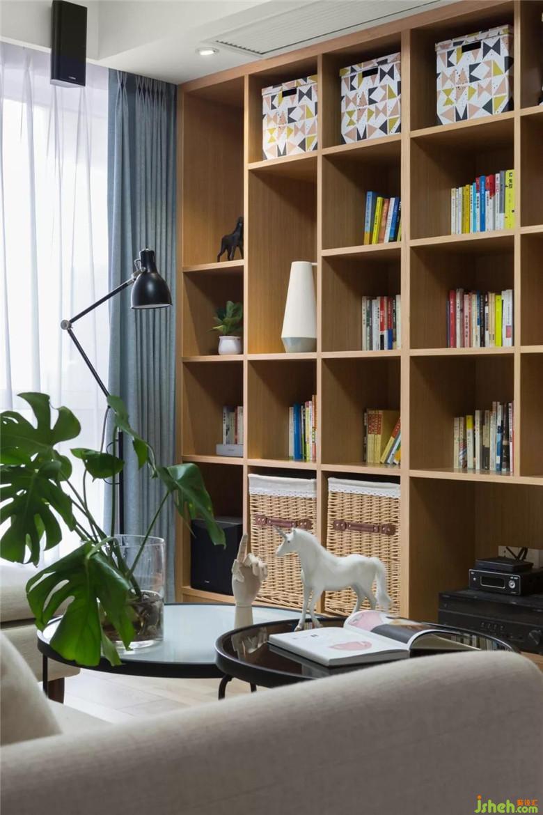 一整面墻的敞開式書柜,同時也把影音設(shè)備收納其中,也滿足了男業(yè)主一直以來的滿墻書柜的愿望,生活在夢想中的房子里,愛人在側(cè),這就是美滿的生活吧!