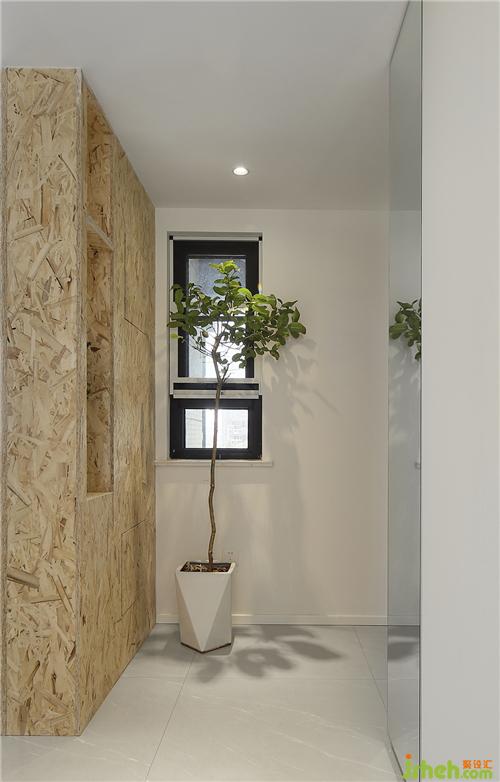 ▲一進門墻面是強弱電箱,為了美觀和控制預算整體用歐松板包起來,左邊的小隔斷可以隨手放手機鑰匙。右邊的鏡柜門里是薄的放雨傘的柜子和鞋柜連在一起,把原來的拐角處理的更整齊,空間完整性更好。