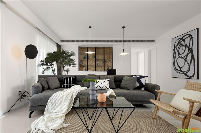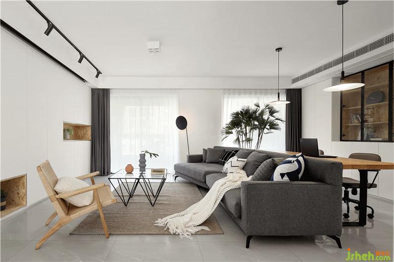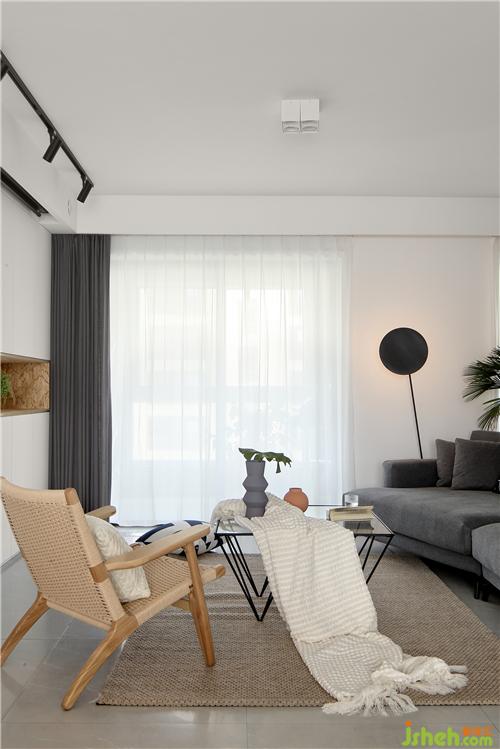 ▲客廳的灰色斜角沙發(fā)豐富空間造型的同時不妨礙通行,原木色的繩編休閑椅具有天然的親切感。