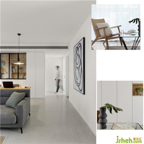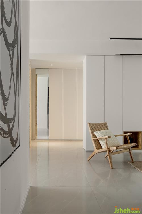 ▲從客廳看向門廳,這一組柜子左邊兩扇門是背面開(kāi)門作為門廳的衣帽柜來(lái)用,右邊的是作為客廳收納。