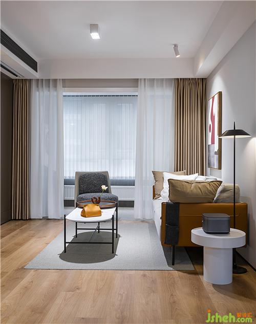 ▲舍棄傳統(tǒng)電視墻,取而代之以幕布和投影實現(xiàn)觀影需求。但更重要的是釋放空間,滿足閱讀和收納的需要。