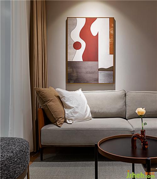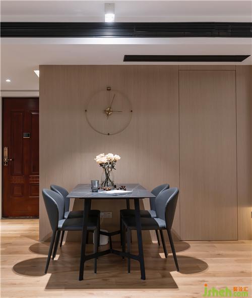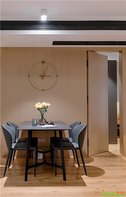 ▲勞倫黑金巖板餐桌,配以灰色真皮餐椅,穩(wěn)重精致。整面的KD板,再內(nèi)嵌隱形門,保持客廳的整體性和完整度。KD板細膩的紋理,天然成為西班牙鐘的鐘面,不著數(shù)字的表盤,讓人領(lǐng)會時間中的留白南京室內(nèi)設(shè)計師。
