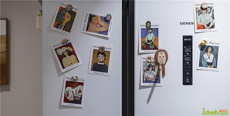 ▲次臥冰箱門上也貼滿了我們從國外帶回來的‘野獸派’的畫作,和設(shè)計師找的畫不謀而合,心有靈犀啊,哈哈哈。