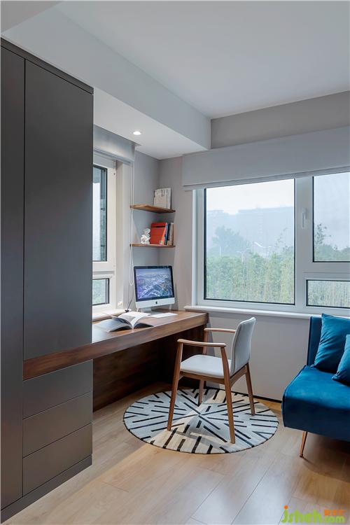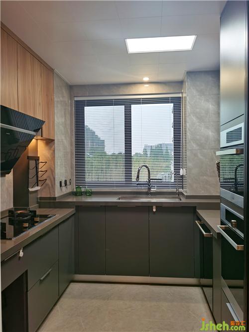 ▲廚房 高柜中內(nèi)嵌蒸箱、烤箱。洗碗機(jī)、拉籃各執(zhí)一邊,合理分區(qū)。下沉式臺盆配以抽拉式水龍頭和凈水龍頭。側(cè)吸的油煙機(jī)凸顯U型廚房的精致。金屬百葉簾調(diào)節(jié)光線南京室內(nèi)設(shè)計師。以女主人身高量身定做的高低臺,操作便捷,烹飪美食,亦是調(diào)味生活。