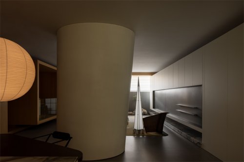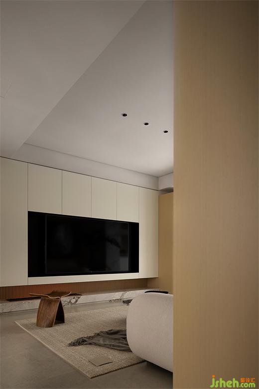 延續(xù)天花的色調,結合板材的光澤與分塊的尺度,締造對稱美感,同時表達均衡的視覺節(jié)奏,將電視屏幕區(qū)的暗度調和,與正前方的書房相互呼應,一透一實,闡述二維跨越三維的敘事氛圍。細木格柵隱于凹嵌空間,襯托大理石氤氳的自然紋理。