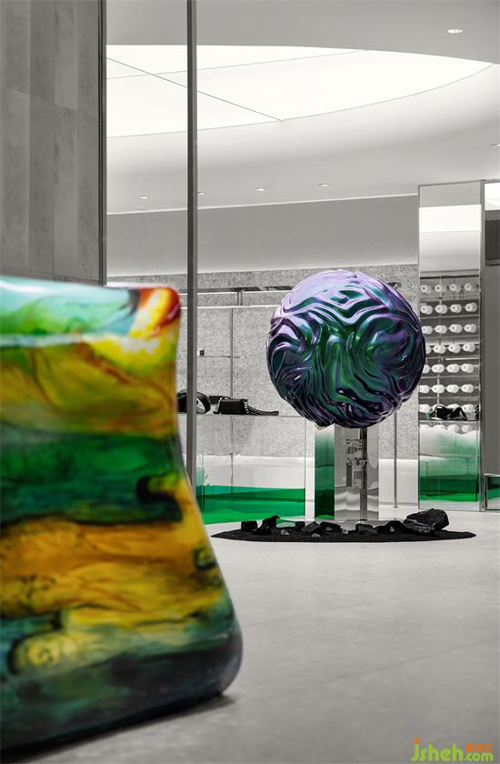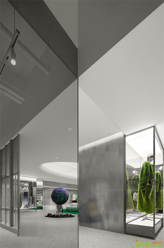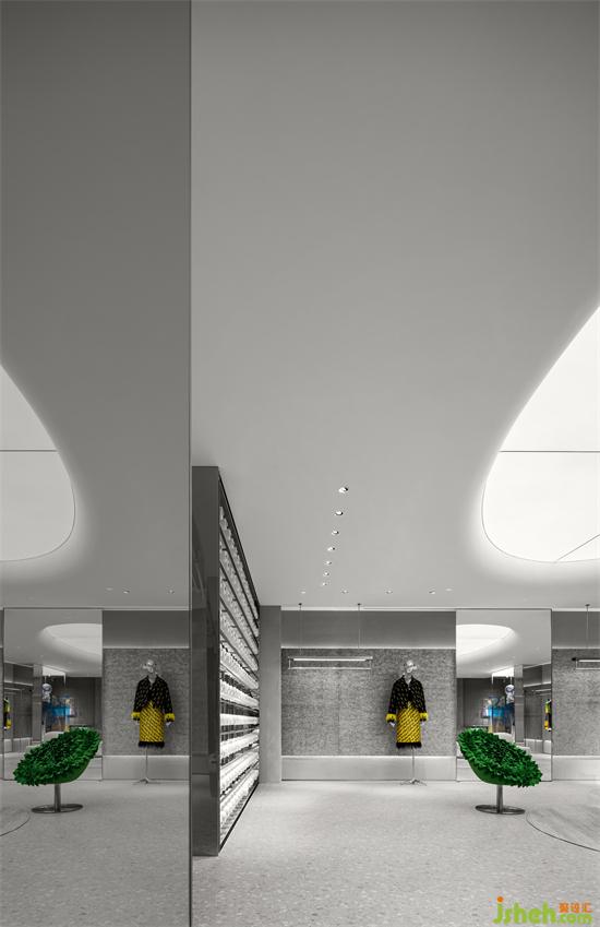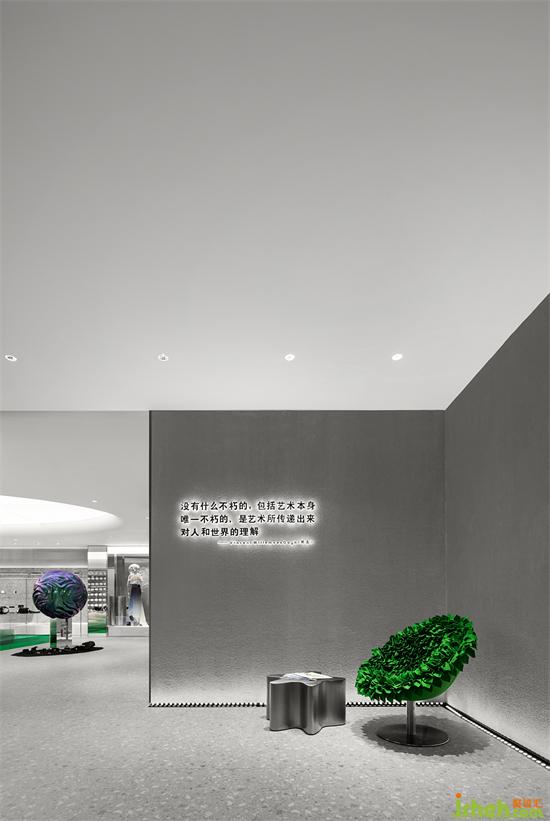 入口的地方是一個色彩斑斕的玻璃鋼的前臺,概念館設計這個造型的設計是從大自然中的一幅畫中提取的元素,炫彩系列也是YW品牌主打的款式之一,讓布料的顏色在空間再次得到延續(xù)和生長,正所謂品牌概念館的設計,我們更多的是傳達品牌深層次的文化屬性,讓空間做為載體去演繹它。