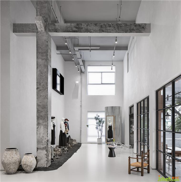 改造后的建筑一樓為服裝設(shè)計師品牌集合店、展示空間、室外庭院及咖啡水吧,二樓為總部辦公室。凱莉莫斯設(shè)計師品牌藝術(shù)館設(shè)計靈感來源于山本耀司對時尚“反盛裝”的理念。所以在空間設(shè)計上我們摒棄了不必要的裝飾, 保留了其內(nèi)的混凝土結(jié)構(gòu)柱子和原始結(jié)構(gòu)粱。室內(nèi)通過地面的高低落差分為兩個區(qū)域,動區(qū)被定義為“開放客廳”。靜區(qū)被定義為“融合社交邂逅”空間。