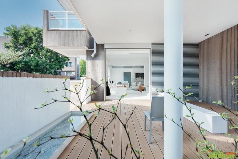 室內(nèi)整體風(fēng)格凸顯現(xiàn)代感,而室外更加親近大自然。淺色木地板與細(xì)紋外墻交相呼應(yīng),桌椅、裝飾則都是飽和度較低的淺色,以及遼闊的無邊游泳池,不僅勾連了室內(nèi)、室外,更與大面積普照的陽(yáng)光融為一體。大型綠植則是后院的亮點(diǎn),姿態(tài)蓬勃的褐色枝干是后院最好的裝飾,與線條平直的淺色桌椅相映成趣;枝頭綻放的點(diǎn)點(diǎn)綠意,則為房子增添了不同于完美樣板間的精彩與生氣。