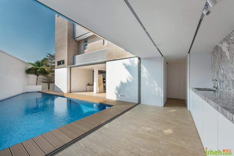 大理石臺(tái)面、白瓷磚、深棕木地板綜合運(yùn)用,只為凸顯游泳池的安逸舒適與無邊奢侈