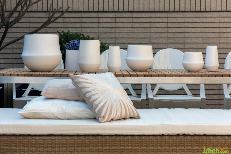 庭院的木質家具搭配著金屬質感的擺設,室內設計師為一樓外的庭院營造出古典與現(xiàn)代的完美融合。綠意盎然的植物點綴其中更是打造出郁郁蔥蔥的戶外景觀和豪華的室內外生活體驗。步入主臥,流線型的架構、輕松的柔和色調配之簡單的裝飾畫,體現(xiàn)了極簡主義塑造地簡潔高品味風格。諾大的玻璃落地窗外探出的絲絲綠意,打破了極簡空間的沉悶感,讓住戶擁抱來自清晨的第一縷陽光。而書房是一隅凈化心靈的居心地,窗內白色搭配原木色,干凈雅致。窗外草色入簾青。是住戶靜心潛讀的不二之選。插入金屬黑的書柜,又不失現(xiàn)代感。