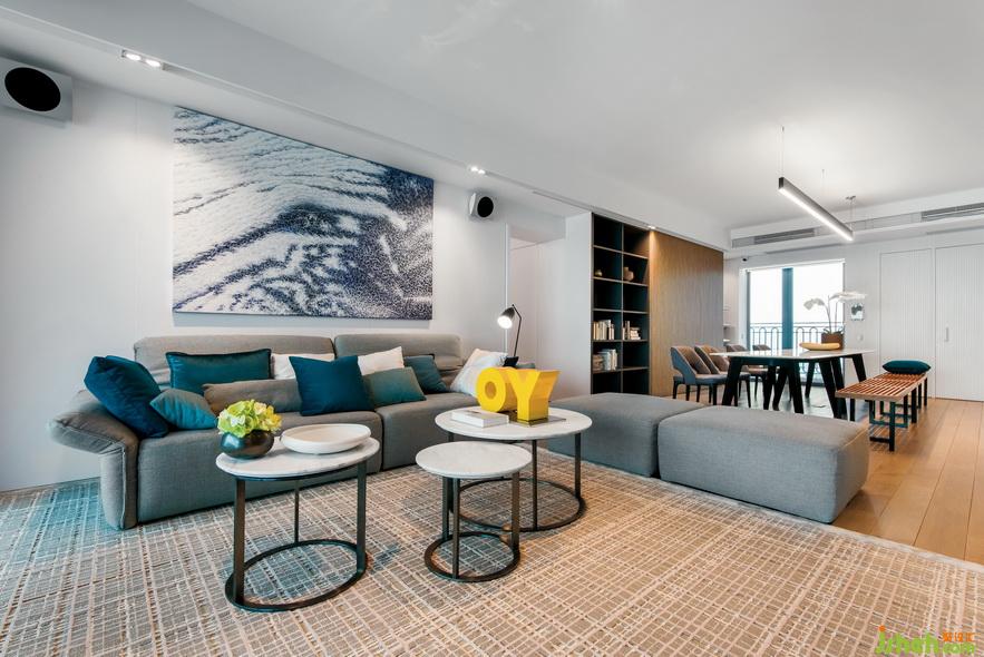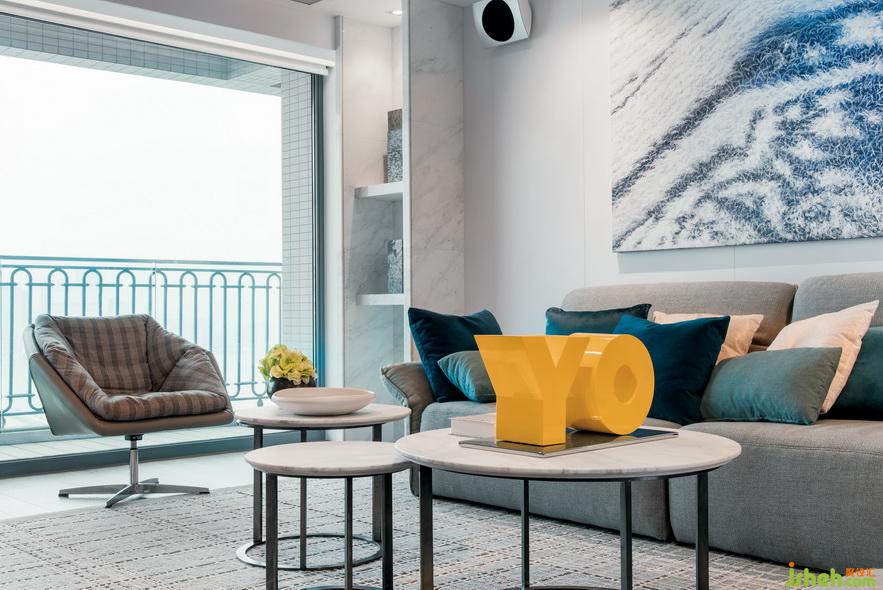 客廳大面積使用灰藍(lán)搭配,掛上靈動百變的藍(lán)色背景畫,與比鄰的大海相呼應(yīng)。灰色元素?zé)o處不在,沙發(fā)的高級灰、地毯的云灰色、仿佛給空間蒙上一層淡淡的面紗,奠定了沉穩(wěn)簡約的風(fēng)格。而深淺不一的藍(lán)色抱枕,盡顯空間層次,給人以變化美感。