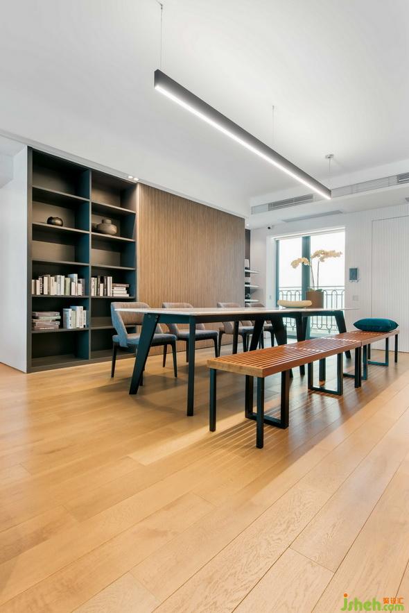 客廳與餐廳間沒有明顯隔斷,室內(nèi)設(shè)計師巧妙地以顏色來劃分。這種留白設(shè)計,做到了“無形似有形”,也保證了空間的通透與視線的暢通。餐廳的設(shè)計極具趣味,灰白布椅正對深灰色墻面是一種現(xiàn)代簡約風(fēng)。實木長椅正對豎木條隔板是一種自然閑適風(fēng)。一個空間兩種風(fēng)格,混搭但不混亂,對立但不沖突。