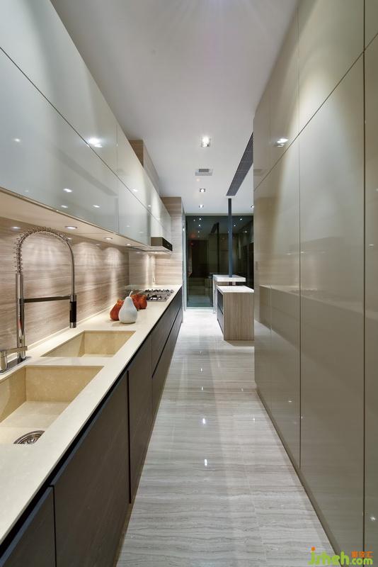 廚房采用一體式設(shè)計(jì),金屬色立柜與餐廳一脈相承,吊頂射燈與香檳色瓷磚不僅未來感十足,更無清潔困難之虞。