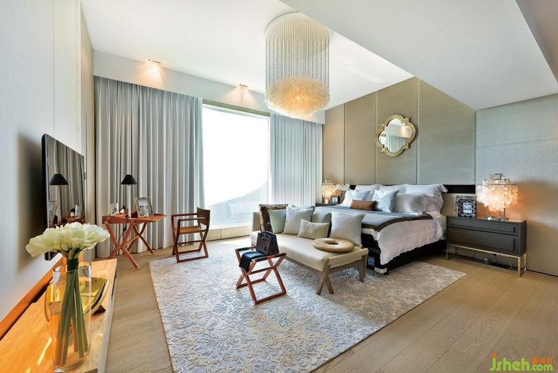 主臥以精煉簡(jiǎn)潔的淺棕色為基調(diào),云母吊燈是空間的主線,床頭背墻的花鏡中亦有云母狀的漩渦紋路。床下的麂皮質(zhì)感的地毯,床邊的象牙白色軟塌,哪怕是實(shí)木制馬扎上隨手?jǐn)[放的Birkin包,無一不彰顯著不凡品味,非凡格局。