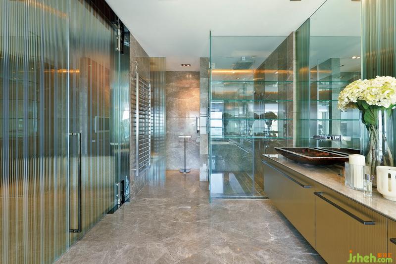 相比大宅的其他空間,盥洗室卻又是另一番素凈天地。彩條設計的玻璃私密性與藝術感兼具,也像是對偏廳屏風的小小致敬與戲謔。橢圓形磨砂質(zhì)感的浴缸令人不由得遐想,置身其中,卸下重擔,憑窗遠眺,那一片太平山海。室內(nèi)設計師