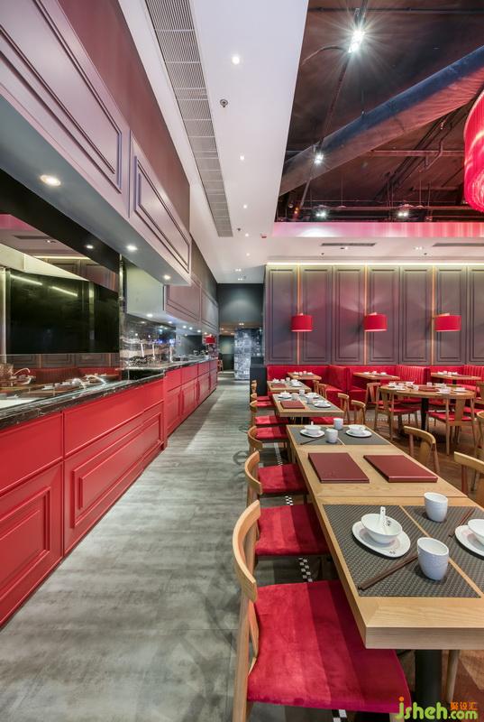 推門而入,整間點(diǎn)心店就令人眼前一亮——原來(lái)雅致與新潮,可以如此高度統(tǒng)一。大面積灰色基調(diào)配上明度較高的朱紅色點(diǎn)綴,并有中性木色穿插其間,就這樣構(gòu)成了新派中式的動(dòng)人畫卷。