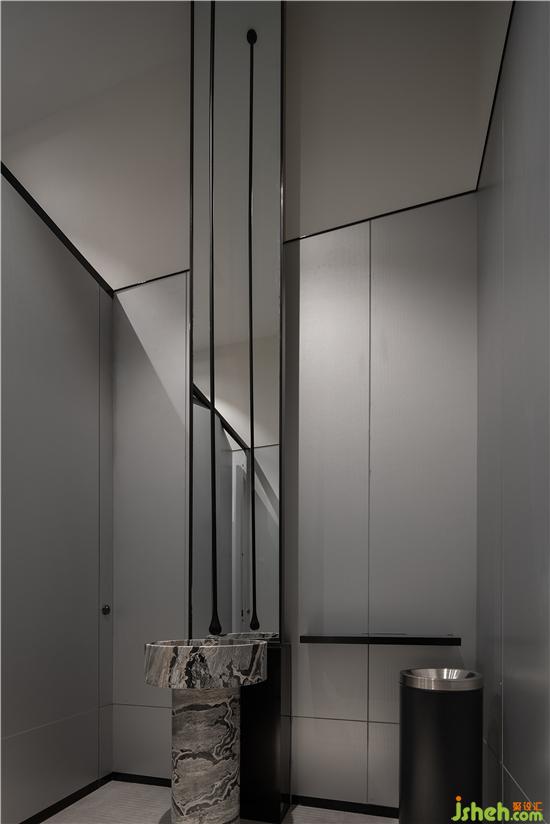 衛(wèi)生間臺盆處的設(shè)計為全場最容易成為雞肋的區(qū)域加分不少,一鏡到頂?shù)脑O(shè)計給了原本狹小的空間極致的延伸;而一根自天花板垂直而下的水滴造型水龍頭更是點睛之筆,利用鏡面反射原理給人造成了水滴懸浮空中的視覺效果。
