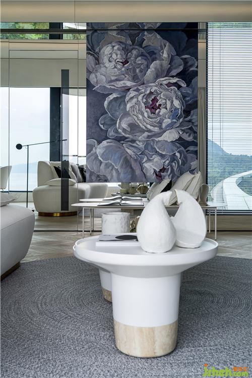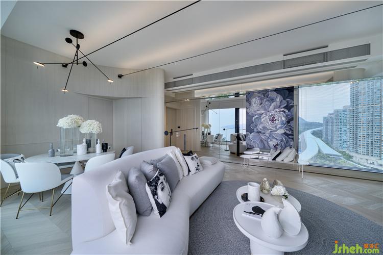 直條和弧線元素兼而有之的單位,偌大的客飯廳以不靠墻身的沙發(fā)作為分區(qū),令視覺上富變化之余,賦予的流動(dòng)性也提供舒適感,饒富趣味。在經(jīng)過入口左方全幅鏡子的反射下,引入戶外的海景,空間和光線頓時(shí)倍增,鏡側(cè)由設(shè)計(jì)公司邀來畫家精心繪畫的巨型花卉油畫,點(diǎn)出了示范單位的花卉主題。