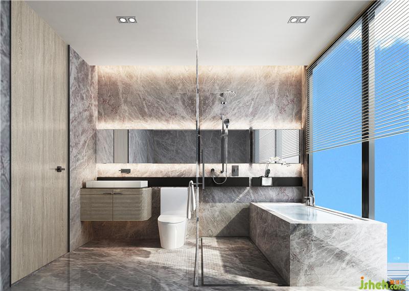 再看主衛(wèi),選用柏斯高灰云紋大理石全屋鋪陳,配上全幅整墻梳妝鏡和兩扇全明落地窗,在氛圍照明和自然光線的互動(dòng)之中通透敞亮。