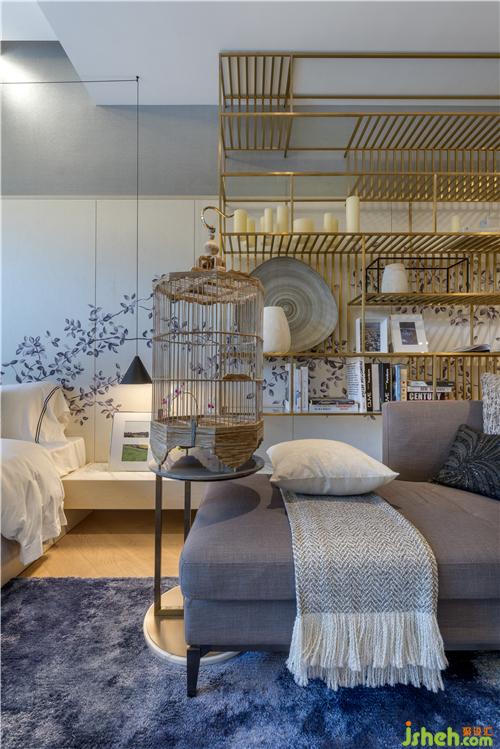 拾級(jí)漫步來到三樓,有限的45㎡空間之內(nèi),設(shè)計(jì)師采用大量的木作圍身為屋主的起居活動(dòng)劃定邊界、守好隱私,嵌套木圍中的隱藏門扇為臥眠、盥洗和起居空間保持相對(duì)獨(dú)立的功能分區(qū)。香港別墅裝飾進(jìn)入主臥,180°全景玻璃幕墻既讓整個(gè)房間的光線無比通透,也讓屋外景觀的自然生機(jī)盡收眼底。隔空懸掛于背墻之上的黃銅格架將器物的實(shí)用之美與工藝之美合二為一、藏秀并舉,與貴妃榻旁、頗具古韻的鳥籠產(chǎn)生了器型、紋理、色彩、溫度的交融浸染、相映成趣。房間內(nèi)藍(lán)色墨染的地毯與花木折枝的墻飾與其他起居空間的中式元素協(xié)調(diào)一致、古韻樸拙。