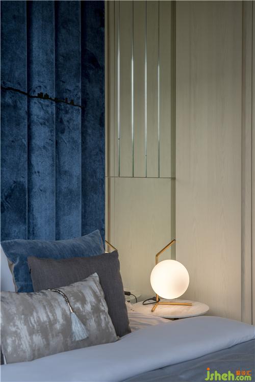 同層右側(cè)區(qū)域的次臥,以摩登現(xiàn)代的港式風(fēng)格作為裝潢基調(diào),選材以布木為主,輔以金屬。布局于背墻中央的藍(lán)色布藝沉穩(wěn)內(nèi)斂、不動(dòng)聲色,一鏡到頂、分置床頭的金屬鏡墻色厲內(nèi)荏、倒影暖光,布藝的質(zhì)樸與金屬的藝術(shù)碰撞出現(xiàn)代,藍(lán)的冷凝與光的氤氳相遇出復(fù)古,共處一室成為現(xiàn)代的復(fù)古。