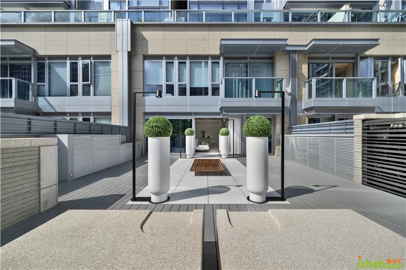 由庭院入戶是打開(kāi)這間用心之作的最佳選擇,你可以發(fā)現(xiàn)Danny團(tuán)隊(duì)“小心思”里的“大布局”。設(shè)計(jì)師沿庭院中軸線靈活地運(yùn)用了多組對(duì)稱排列:中部由外至內(nèi)對(duì)應(yīng)布局兩處休憩區(qū),一塊碩大的金色麻石一分為四,細(xì)節(jié)粗糲、香港別墅裝飾沉穩(wěn)而厚重,與之呼應(yīng)的是庭院中央一方較小的實(shí)木矮凳,質(zhì)感細(xì)膩、色厲而內(nèi)荏;分立兩側(cè)的三組巨型花筒,一字排開(kāi),延伸入室,素白的超高桶身與蔥郁的渾圓花球,柔和了此前矮凳尖銳的幾何突觸,并與粗點(diǎn)白麻石的地磚一起為戶外空間奠定了素雅大氣的色調(diào)氛圍;