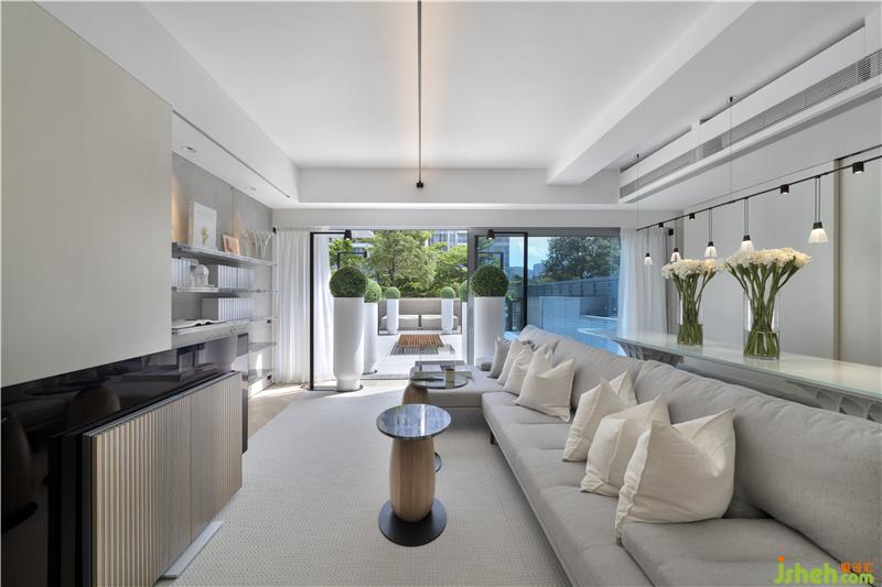在房屋門楣挑高有限的情況下,設(shè)計(jì)師采取橫向拓寬采光面積搭配全落地玻璃的方案,把充沛的自然光源與新鮮空氣引入客廳,加強(qiáng)室內(nèi)外空間聯(lián)動(dòng);同時(shí)增加室內(nèi)挑高,減低壓迫感,香港別墅裝飾配合入門處不加雕琢的水泥展示墻與全屋現(xiàn)代簡(jiǎn)約的素色裝潢,整個(gè)空間熟稔親切、干凈自然。